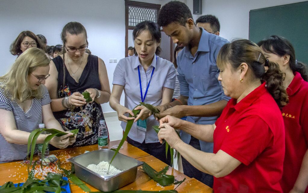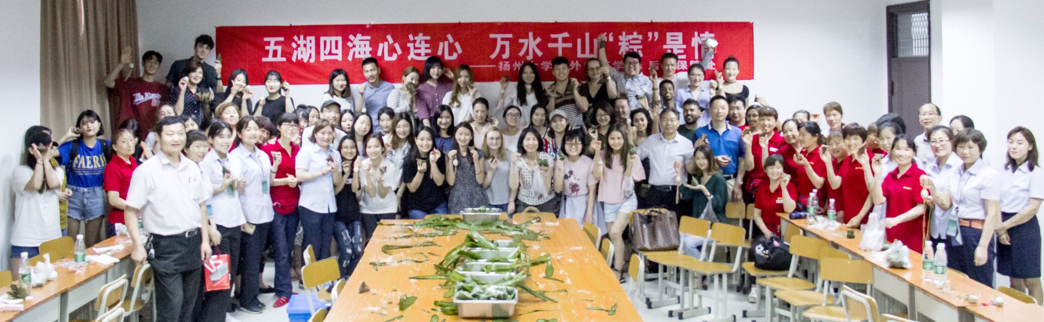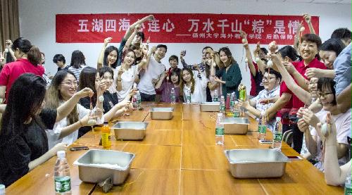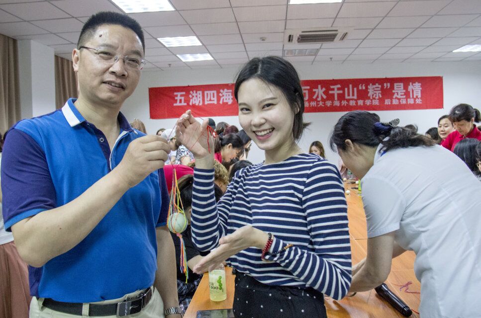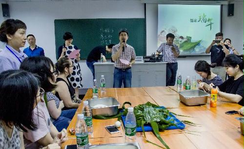 Practical Lecture on Experiencing Dragon Boat FestivalA practical lecture on Experiencing Dragon Boat Festival was jointly held by the College for Overseas Education and the Logistics Department on June 14th. Nearly 70 international students learned stories and traditions of Dragon Boat Festival and tried making their own Zongzi, longevity bracelets and egg nets under the guide of their Chinese language teachers and the logistic service staff. The practical lecture brought to international students not only traditional Chinese culture, but also the care and concern from the teachers and logistic service staff. Over 30 logistic service staff and the leaders from College for Overseas Education and Logistics Department participated in the lecture.