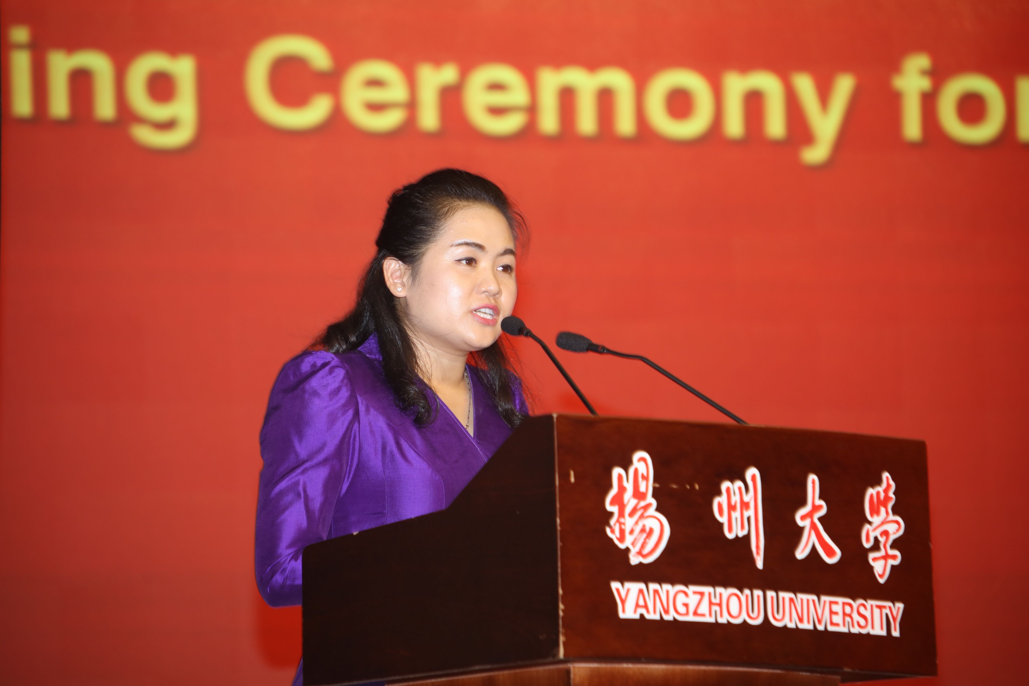 PHIPHAKKHAVONG PHOUTHAVANH, a new Ph.D. candidate from Laos spoke at the ceremony as representative of new international postgraduates. In her speaking, she mentioned the long-term friendly relationship between China and her motherland, introduced the active role that Laos and the Laotians played in the Belt and Road initiative. She told her stories with China and the gratitude and happiness that she felt when getting the opportunity to pursue doctoral studies in YZU. Inspired by the YZU motto “perseverant and self-reliant”, she expressed her determination to study hard with unremitting efforts, and to be a knowledgeable, virtuous, humanistic YZUer
