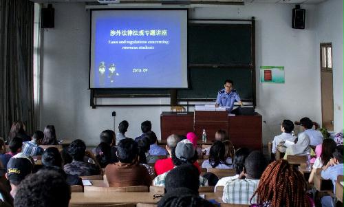 2018 Autumn Semester Orientation for New International StudentsThe 2018 autumn orientation for new international students was held by COE on the afternoon of Sept. 26. Mr. Chen Jin, police officer from Yangzhou Exit and Entry Administration Office, and Mr. Han Honggen, Peace Officer from YZU Security Department were invited to give lectures on Exit and Entry Administration Law and campus safety to nearly 130 new international students.
