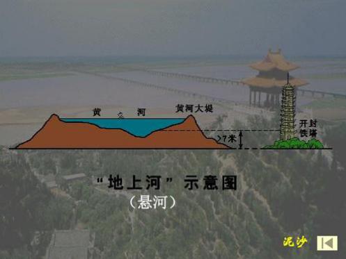 河床高出两岸地面的河,又称“地上河”。由于黄河是一条高含沙的河流,沙土随着河水的流动而逐渐在河道中淤积,使得黄河下游(郑州以下)的河底平均高于河外地面,形成著名的地上悬河。