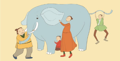 Long ago, there were four blind people. They wanted to know what elephants looked like. Because of the blindness, they could only touch the elephant.