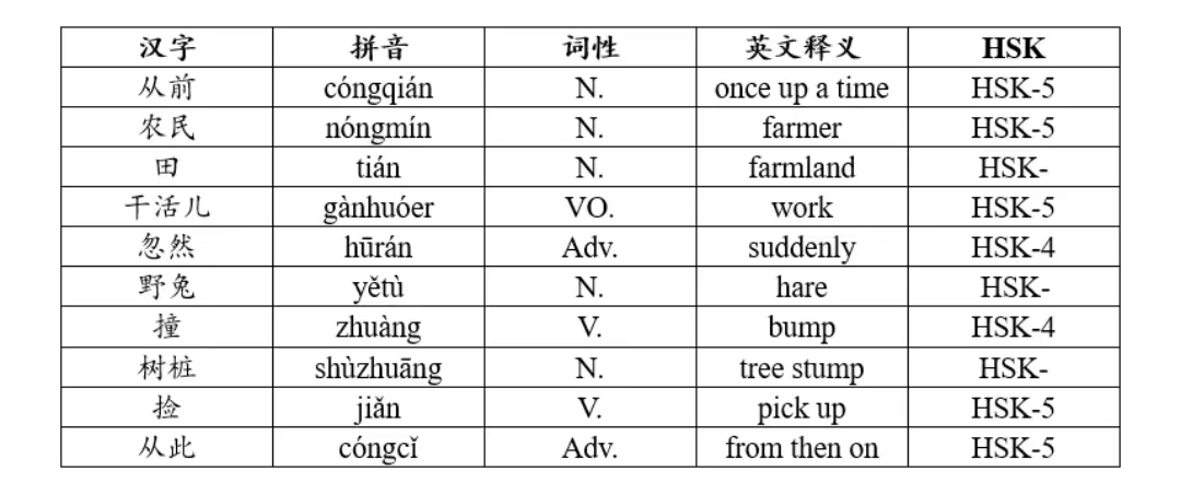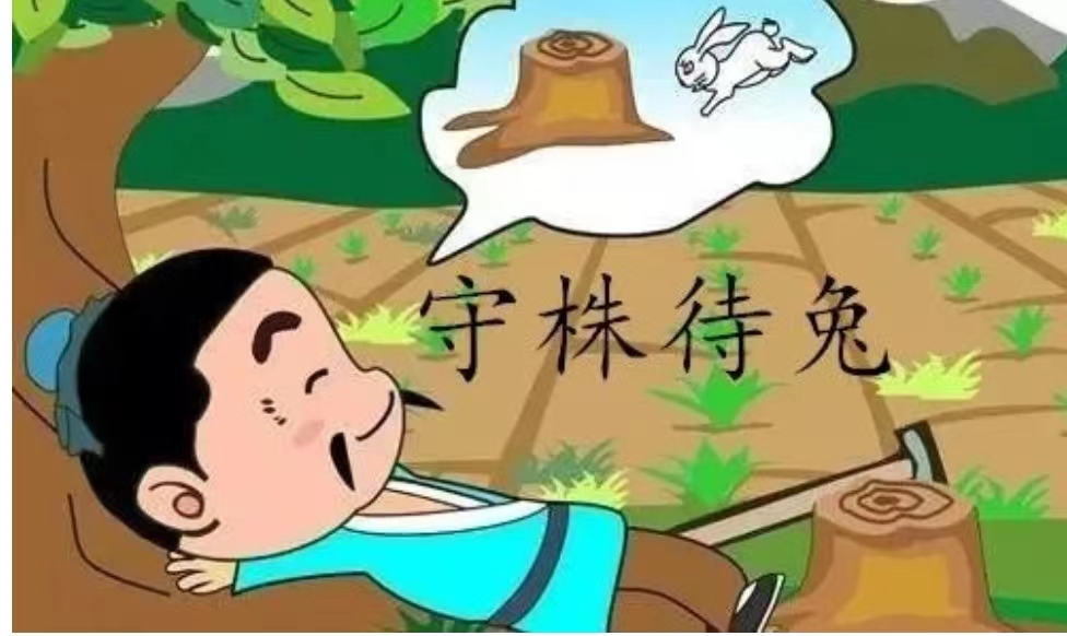 从前,有一个农民。一天,他在田里干活儿的时候,忽然跑过来一只野兔,恰好撞在一个树桩上,撞死了。农民把兔子捡起来带回了家,美美地吃了一顿兔肉。当晚,他就想:“我何必辛辛苦苦地干活儿呢?每天在树桩旁等着捡撞死的野兔就好了。”于是他从此不再干活儿,每天在树桩旁等待野兔的到来。
